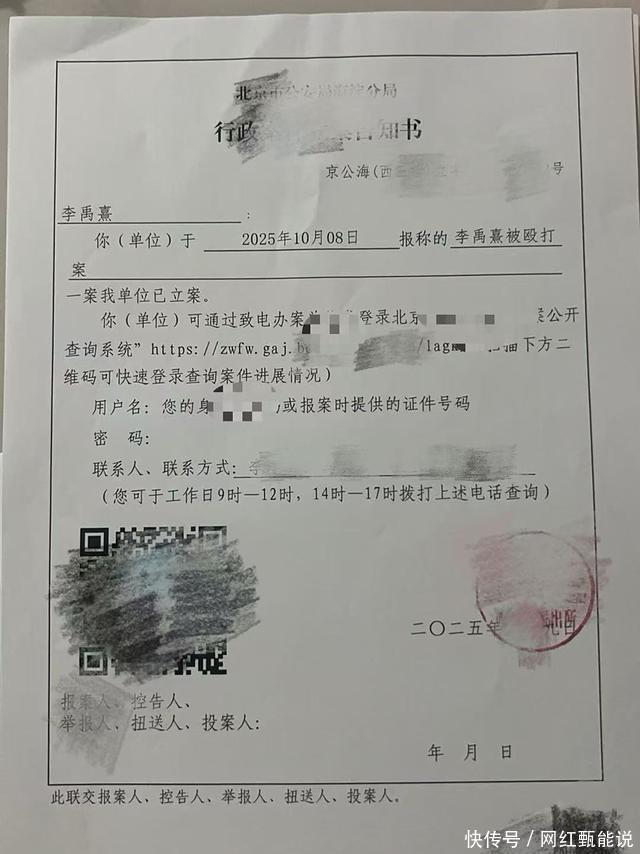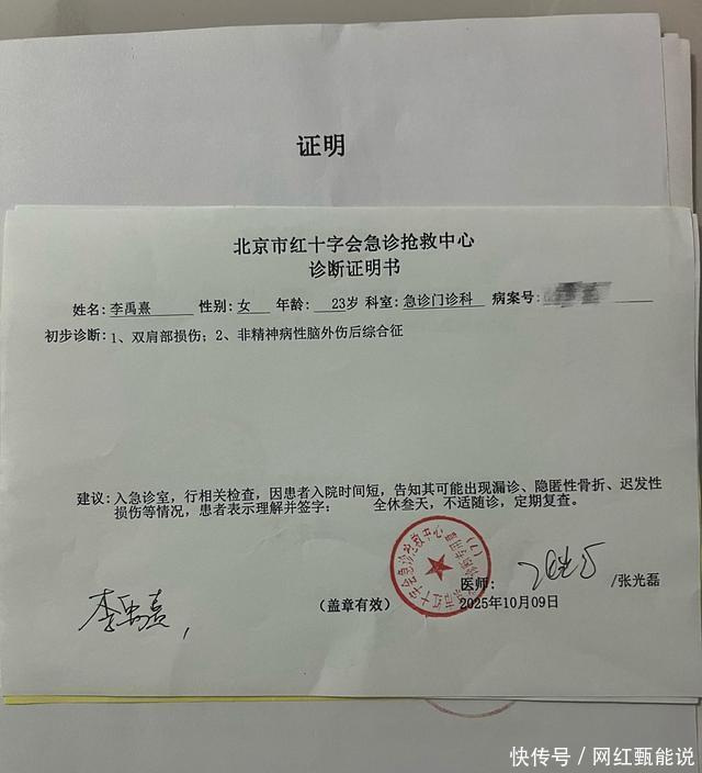 2025年10月8日,李禹熹前往荣梓杉住所沟通时,被其拎摔在地两次(头部、肩部着地),进门时遭脚踹,全程未还手。她立即报警并验伤,诊断显示多处损伤(头部/胸部/腹部)及非精神病性脑外伤后综合征。 经纪团队介入。荣梓杉经纪人闯入现场录像,反指控李禹熹私闯民宅的狂热粉丝并二次报警。荣梓杉在警局否认恋爱关系,称女方臆想,后改口主张互殴。警方已立案(附立案告知书),但因现场无直接监控,责任认定存争议,李禹熹表示将坚持法律途径解决。
