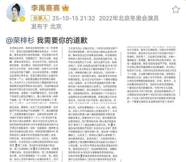 #秋季图文激励计划# 【女演员李禹熹喊话荣梓杉道歉,称他出轨打人】
